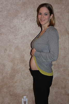 I'm still not wearing the maternity pants, they just fall down and are annoying. So, I'm still wearing my regular pants and just looping them together with rubber bands. I went shopping and got a few shirts. I'm not loving maternity clothes, I think they're not that cute. So, I'm trying to find 'regular' clothes that are long enough to fit. I guess once I get super big, I'll have to switch to maternity clothes full time. Oh boy!